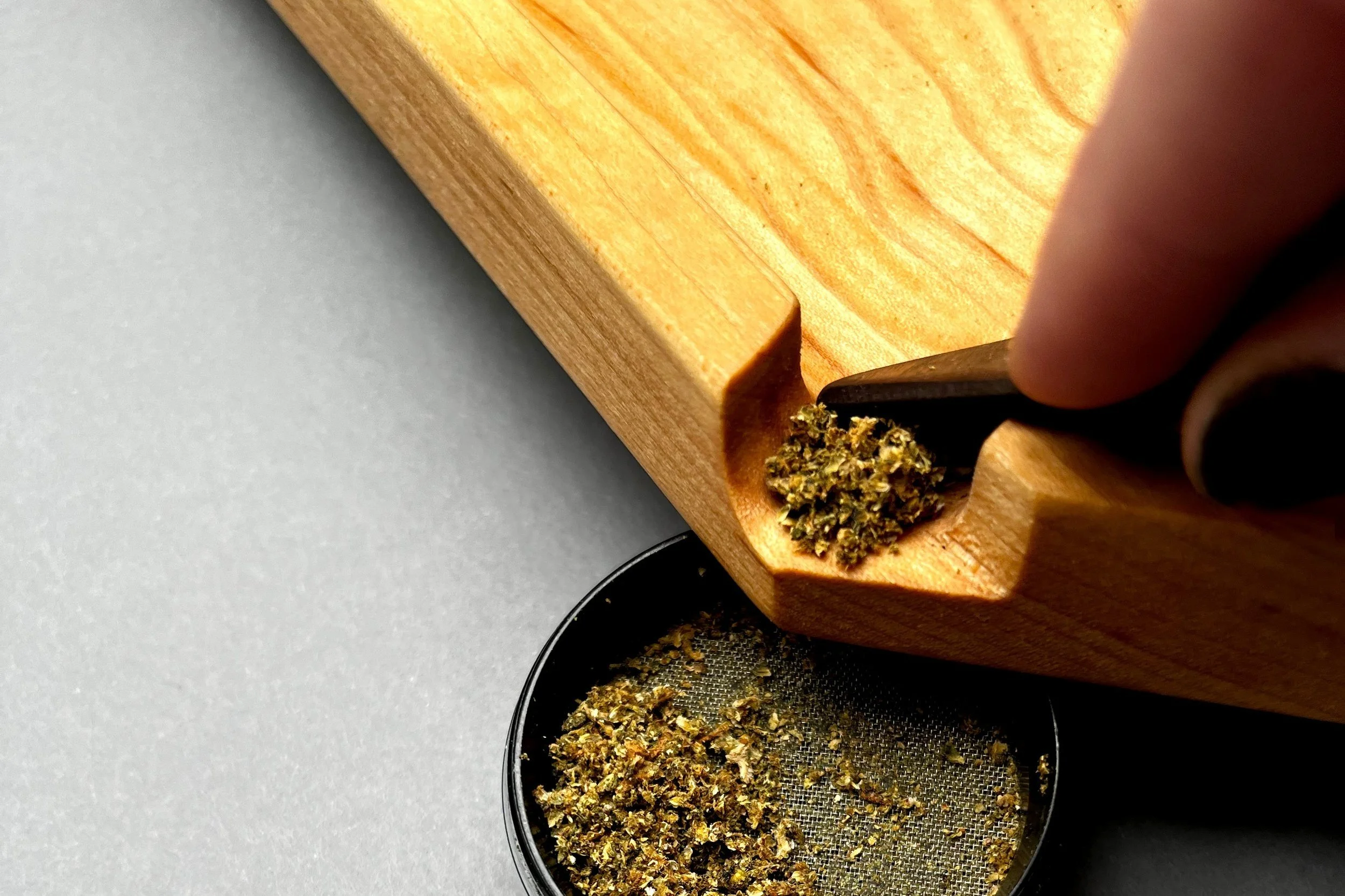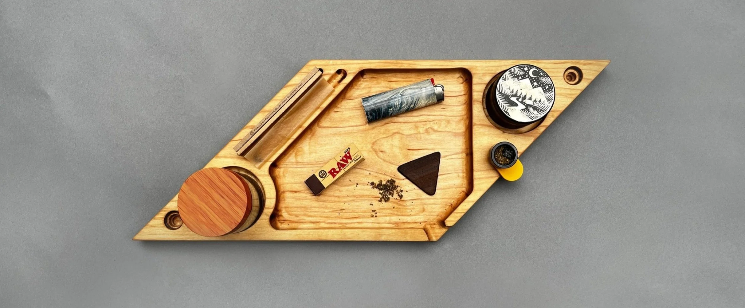 The Prep Tray was created for those who enjoy rolling up or using glass & ceramic ware. (We even had a customer utilize this tray in his D&D Campaigns). Derived from a love of geometry and its inherent place within nature, the parallelogram shape aims to inspire. Pictured below is a Prep Tray in use as well as a closer look at the Tidy Tool, used to gather up any remnants after preparing your desired method of leaves.